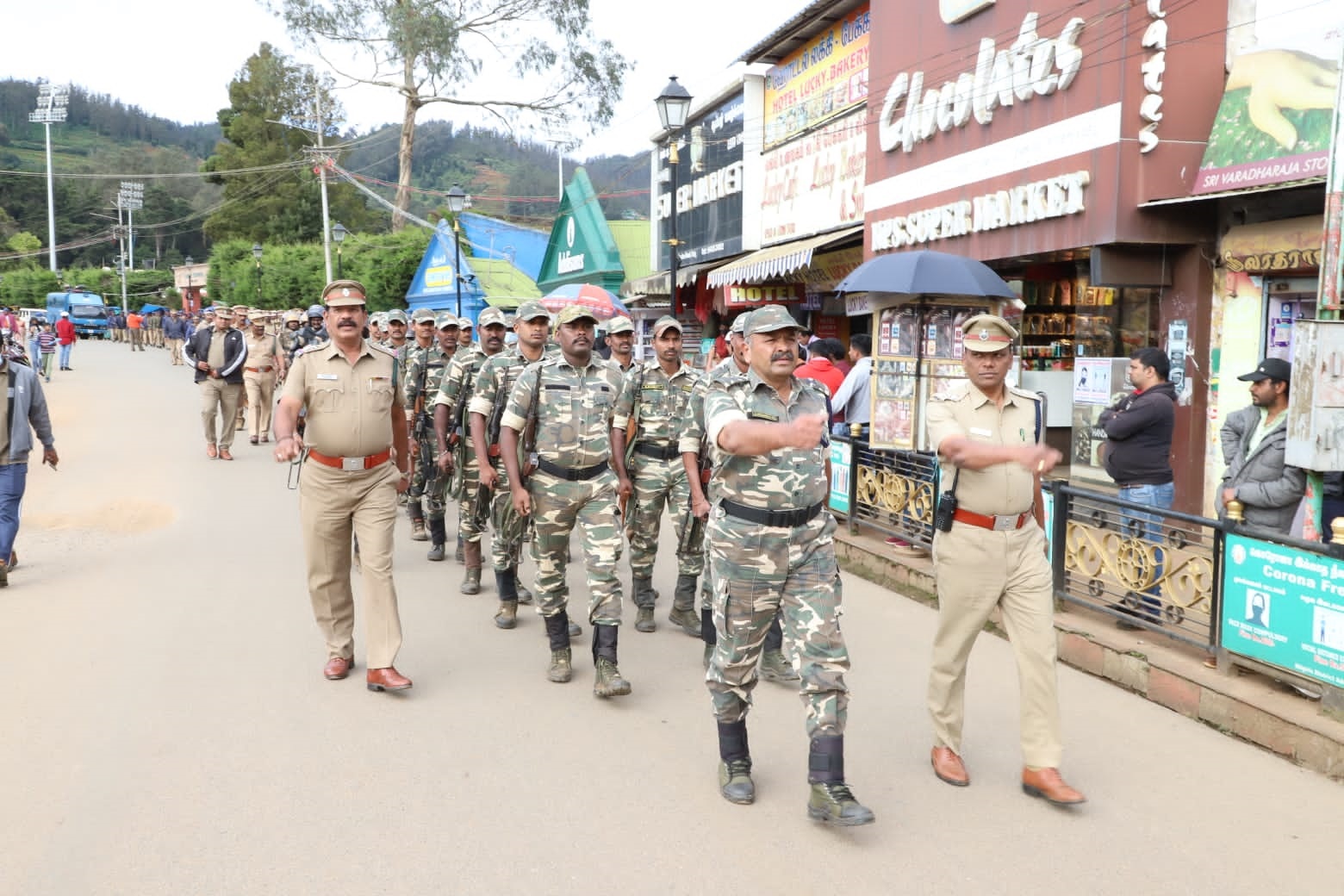 காந்தல் முக்கோணம் முதல் பென்னட் மாா்க்கெட் வழியாக ரோகிணி ஜங்ஷன் வரையிலும், லாலி இன்ஸ்டிடியூட் முதல் சேரிங் கிராஸ் வழியாக ரவுண்டானா வரையிலும் கொடி அணிவகுப்பு நடத்தப்பட்டது.