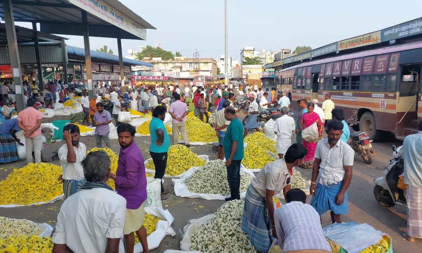 இன்றைய பூக்கள் சந்தையில் குண்டு மல்லி கிலோ ரூ.400, கனகாம்பரம் கிலோ ரூ.400, சன்ன மல்லி கிலோ ரூ.280, அரளி கிலோ ரூ.60, பட்டன் ரோஸ் கிலோ ரூ.60, தாமரை ஒரு மொட்டு ரூ.20, சம்பங்கி ரூ.60, செண்டுமல்லி ரூ.10, சாமந்தி ரூ.20 , பன்னீர் ரோஸ் ரூ.40, வெள்ளை சாமந்தி ரூ.40 என விற்பனையானது.
