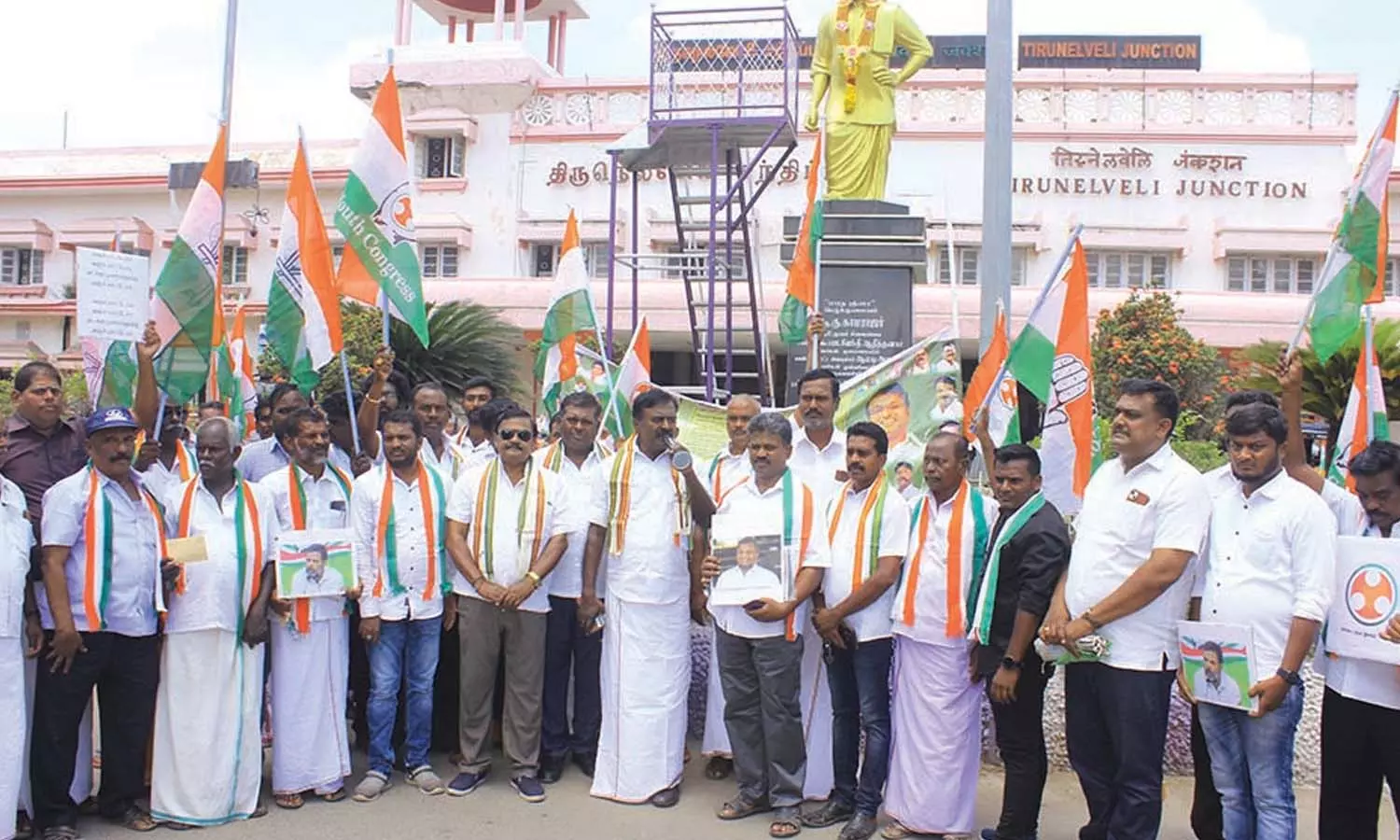 இந்நிலையில் நெல்லை மாநகர் மாவட்ட இளைஞர் காங்கிரஸ் சார்பில் நெல்லை சந்திப்பு ரெயில் நிலையம் முன்பு இன்று ஆர்ப்பாட்டம் நடை பெற்றது. இளைஞர் காங்கிரஸ் தலைவர் ரில்வான் தலைமை தாங்கினார். நெல்லை சட்ட மன்ற தொகுதி பொதுச் செயலாளர் வில்லியம், ஒருங்கிணைப்பாளர் வடிவேல் குமரன் ஆகியோர் முன்னிலை வகித்தனர். சட்டமன்ற தொகுதி துணைத்தலைவர் ராஜகுரு வரவேற்று பேசினார்.