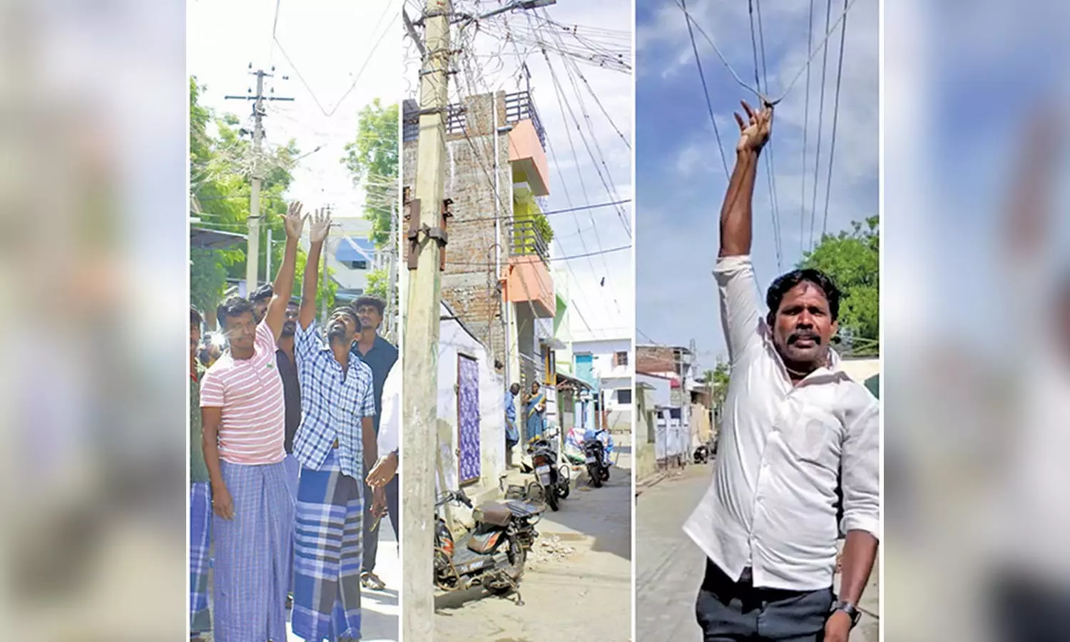 கைகளால் தொட்டுவிடும் தூரத்தில் மின்வயர்கள் செல்வதை சுட்டிக்காட்டும் பொதுமக்கள்.