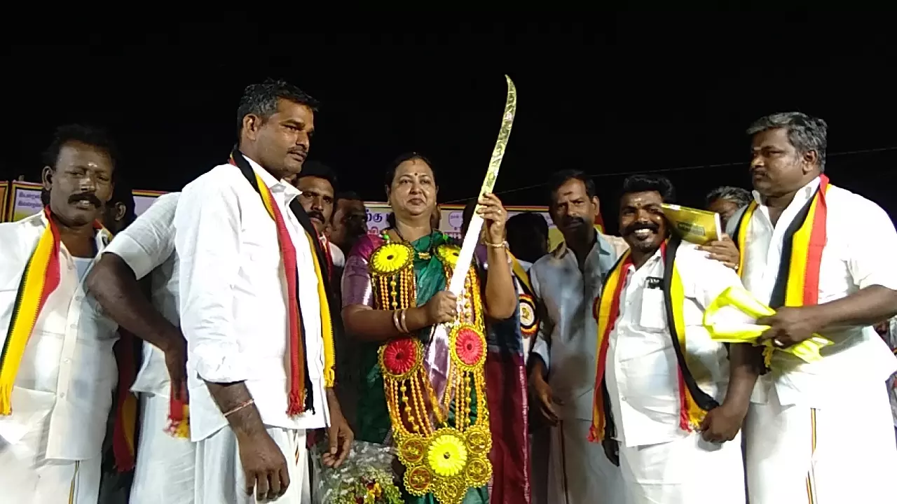 அறந்தாங்கி அருகே ஆவுடையார்கோவில் கடைவீதியில் ஒன்றியச் செயலாளர் மகாலிங்கம் ஏற்பாட்டில் நடைபெற்ற கட்சியின் 19-வது ஆண்டு தொடக்கவிழா, விஜயகாந்த் பிறந்த நாள் விழா மற்றும் பொதுமக்களுக்கு நலத்திட்ட உதவிகள் வழங்கும் முப்பெரும் விழா நடைபெற்றது.இதில் பிரேமலதா விஜயகாந்த் பங்கேற்று சிறப்புரை ஆற்றினார். அப்போது அவர் பேசுகையில், சனாதன கொள்கையை 40 ஆண்டுகளுக்கு முன்பு பங்காரு அடிகளார் கொண்டு வந்துள்ளார். அவர் மறைவிற்கு செல்ல முடியாததால் பொதுக்கூட்ட மேடையிலே பொதுமக்களுடன் சேர்ந்து அஞ்சலி செலுத்தினார். சென்னை சென்றவுடன் மேல்மருவத்தூருக்கு சென்று உறவினர்களிடம் ஆறுதல் கூற உள்ளதாக கூறினார்மேலும் புதுக்கோட்டை மாவட்டத்திற்கு ஒரு தனி பெருமை உண்டு. அதிக அளவில் ராணுவத்தில் சேருவது இங்கு உள்ள இளைஞர்கள் தான் இந்தப் பெருமை தமிழ்நாட்டிற்கு மட்டும் அல்ல, இந்தியாவிற்கே புகழ் சேர்க்கும் மாவட்டமாக விளங்கி வருவதால் அவர்களுக்கு ஒரு ராயல் சல்யூட் என்று புகழாரம் சூடினார்.பின்பு பொது மக்களுக்கு நலத்திட்ட உதவிகளை வழங்கினார். கட்சி நிர்வாகிகள் பிரேமலதா விஜயகாந்த்க்கு சந்தன மாலை அணிவித்து கையில் வீர வேல் வழங்கினர். நிகழ்ச்சியில் கட்சி நிர்வாகிகள் பொறுப்பாளர்கள் ஏராளமானோர் கலந்து கொண்டனர்.