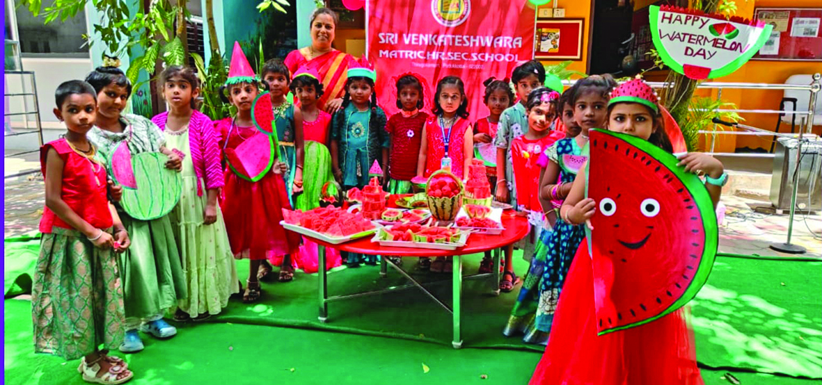 புதுக்கோட்டை ஸ்ரீவெங்கடேஸ்வரா மெட்ரிக்.மேல்நிலைப் பள்ளியில் தாகத்தை தீர்க்கும் தர்பூசணிப்பழதினம் கொண்டாடப்பட்டது. சர்வதேச தர்பூசரணி தினமாக உலகெங்கும் கொண்டாடப்படும் நாளில் பள்ளியில் எல்.கே.ஜி முதல் இரண்டாம் வகுப்பு மாணவர்கள் வீட்டிலிருந்து தர்பூசணிஜுஸ் மற்றும் தர்பூசணி பழக்கீற்றுகளையும் கொண்டுவந்தனர்.மழலைக் குழந்தைகள் பச்சை சிவப்பு வண்ணங்களில் தர்பூசணி வேடமணிந்தும், கழுத்து காதுகளில் தர்பூசணி வடிவத்தோடுகள் சங்கிலிகள் அணிந்து வந்தனர்.வகுப்பறைகளில் தர்பூசணிக்கீற்றுகளால் தோரணங்கள் அமைக்கப்பட்டிருந்தன. தர்பூசணிக் பழக்கீற்றுகளால் உருவாக்கப்பட்ட ஐஸ்கிரீம், லாலிபாப், கேக்குகள், கூடைநிறைய கீற்றுகள் என குழந்தைகள் ஆசை ஆசையாய் வியந்து பார்க்கும் வண்ணம் காட்சிப்படுத்தப் பட்டிருந்தன. மழலைக் குழந்தைகள் தாங்கள் கொண்டு வந்த தர்ப்பூசணிக்கீற்றுகளை பக்கத்து வகுப்பறைகளுக்குச் சென்று குழந்தைகளுக்கு கொடுத்து மகிழ்ந்தனர்.தர்பூசணி தினத்தை கொண்டாடும் விதமாக பள்ளியின் மழலை மாணவர்கள் தர்பூசணிபழம் தொடர்பான பாடல்கள், செய்திகளைக் கூறும் நிகழ்வு நடைபெற்றது .இந்த நிகழ்ச்சி குறித்து பள்ளி முதல்வர் கவிஞர்தங்கம்மூர்த்தி கூறும்போது,பொதுவாக தர்பூசணி பழம் வெயில் கொடுமையிலிருந்து நம்மைக்காக்கும் இயற்கை குளுக்கோஸ் ஆகும். இது உடல் சூட்டைத் தணிப்பதோடு ரத்த அழுத்தத்தை கட்டுக்குள் வைக்கிறது. சிறுநீரகக்கற்கள் உருவாவதைத் தடுக்கிற ஆற்றல் தர்பூசணிக்கு உண்டு வேறெங்கும் இல்லாத வகையில் எங்கள் பள்ளியில் மழலை மாணவர்களை மகிழ்விக்கும் விதமாகவும், குழந்தைகளுக்கு தேவையான ஆரோக்கிய உணவுப்பொருட்களை அறிமுகப்படுத்தும் விதமாகவும் இதுபோல பயனுள்ள தினங்களைக் கொண்டாடுகின்றோம். பெற்றோர்களும் மிகுந்த ஆர்வத்தோடு குழந்தைகளைக் கொண்டாடும் நிகழ்வுகளில் பங்கெடுக்கின்றனர்.என்றுகூறினார். நிகழ்வில் பள்ளியின் துணைமுதல்வர் குமாரவேல், ஒருங்கிணைப்பாளர்கள் கௌரி, கோமதி மற்றும் மழலையர் வகுப்பு ஆசிரியர்கள் கலந்து கொண்டனர்.
