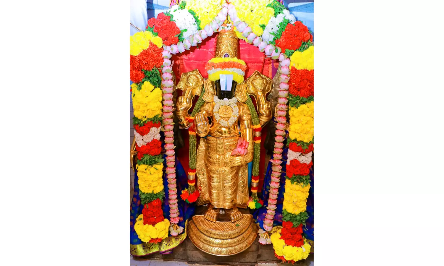 - பின்பு பெருமாளுக்கு தங்க கவசம் அணிவிக்கப்பட்டு, 12அடி உயரமுள்ள ஏலக்காய் மாலை, தாமரை மாலை ஆகியவை சாத்தப்பட்டது