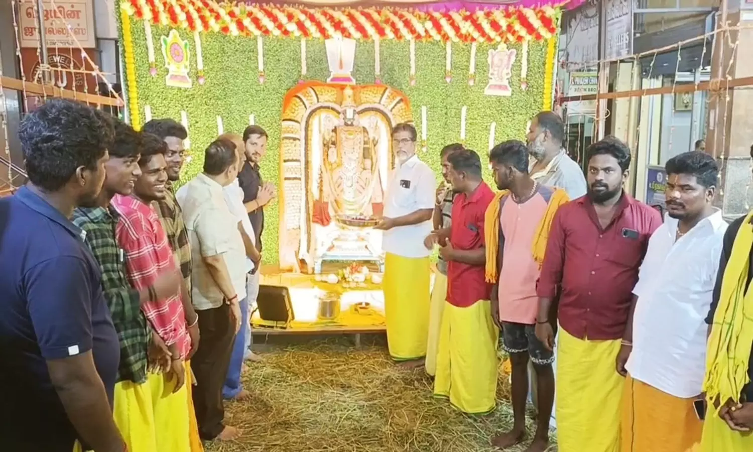 முன்னதாக ஸ்ரீதிருப்பதி திருமலை பாதயாத்திரை குழுவினர் சார்பாக ஸ்ரீசீனிவாச பெருமாள் சர்வ அலங்காரம் செய்யப்பட்டு பட்டாடை உடுத்தி 1008 லட்டுகள் கொண்டு உருவாக்கப்பட்ட மாலை அணிவித்து தீபாராதனை நடைபெற்றது.