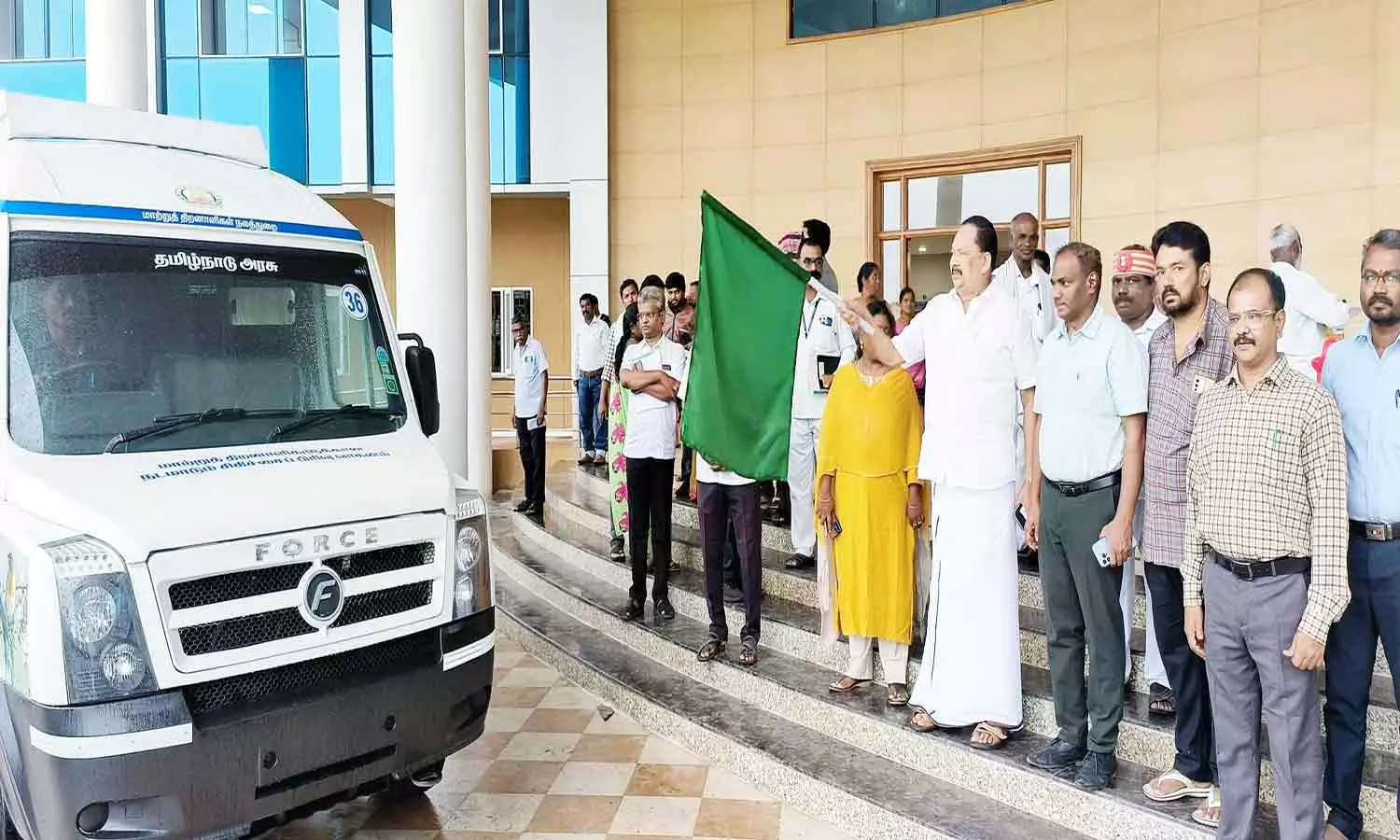 ராணிப்பேட்டை கலெக்டர் அலுவலக வளாகத்தில் நடமாடும் சிகிச்சை வாகனத்தை கைத்தறி மற்றும் துணிநூல் துறை அமைச்சர் காந்தி கொடியசைத்து துவக்கி வைத்தார்.