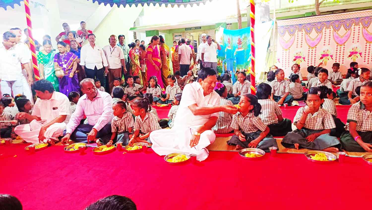 ஆற்காட்டில் காலை சிற்றுண்டி உணவு திட்டத்தை அமைச்சர் காந்தி தொடங்கி வைத்த காட்சி.