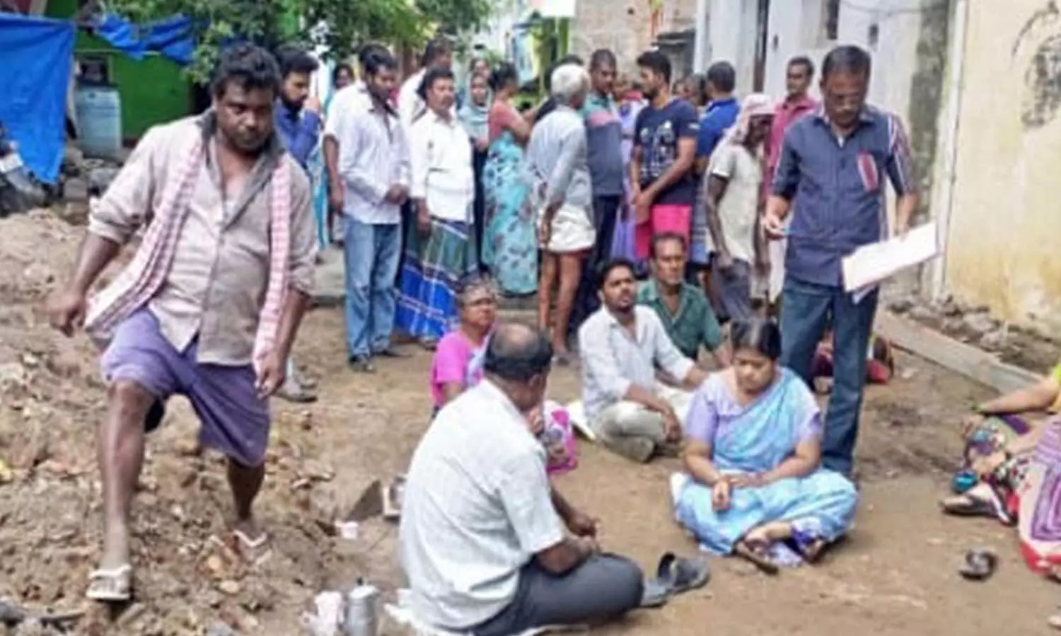 இதில் அதே பகுதியில் வசிக்கும் கஸ்தூரி- ரங்கன் தம்பதியினர் தனது குடும்பத்தினருடன் நகராட்சி பணிகளை நிறுத்தி அமர்ந்து தர்ணாவில் ஈடுபட்டனர்.