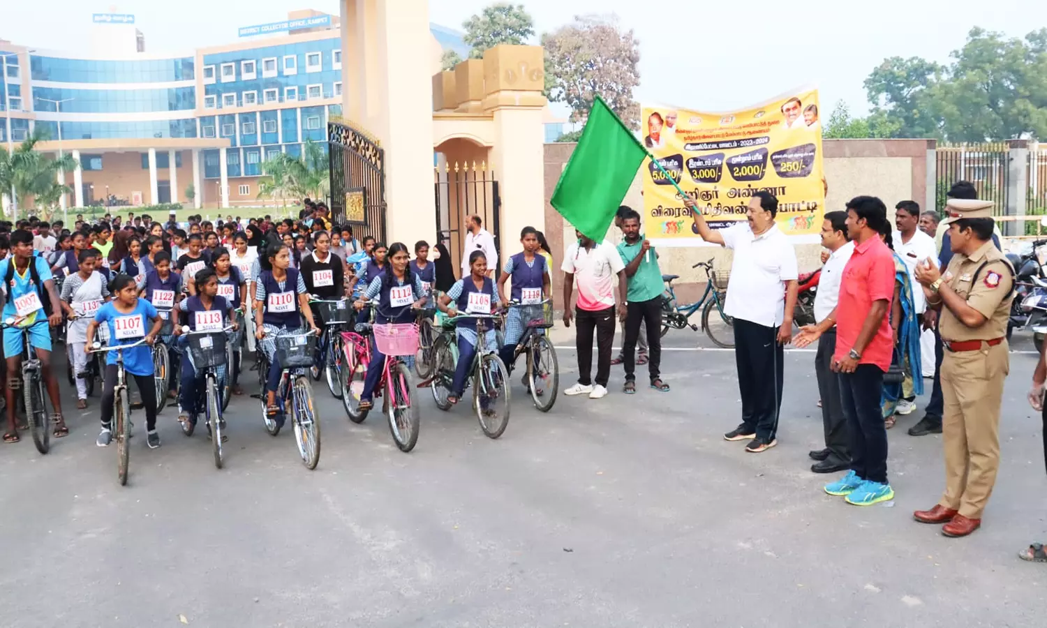 இன்று காலை சைக்கிள் ஓட்ட போட்டியை கைத்தறி மற்றும் துணிநூல் துறை அமைச்சர் ஆர். காந்தி தலைமை தாங்கி கொடி அசைத்து தொடங்கி வைத்தார். இதில் மாவட்ட வருவாய் அலுவலர் சுரேஷ், கூடுதல் போலீஸ் சூப்பிரண்டு விஸ்வேஸ்வரய்யா, மாவட்ட விளையாட்டு மற்றும் இளைஞர் நலன் அலுவலர் ஞானசேகரன் ஆகியோர் உட்பட பலர் கலந்து கொண்டனர். இந்த போட்டிகளில் ஏராளமான பள்ளி மாணவ, மாணவிகள் கலந்து கொண்டு ஆர்வமுடன் சைக்கிளை ஓட்டி சென்றனர்.