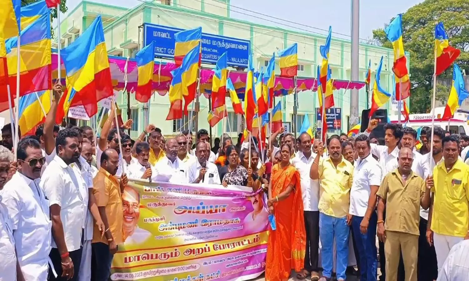 ராணிப்பேட்டை மேற்கு மாவட்ட பா.ம.க. சார்பில் வாலாஜாவில் உள்ள மாவட்ட அரசு தலைமை மருத்துவமனையின் நிர்வாக சீர்கேட்டை கண்டித்து மருத்துவமனை முன்பு ஆர்ப்பாட்டம் செய்தனர்.