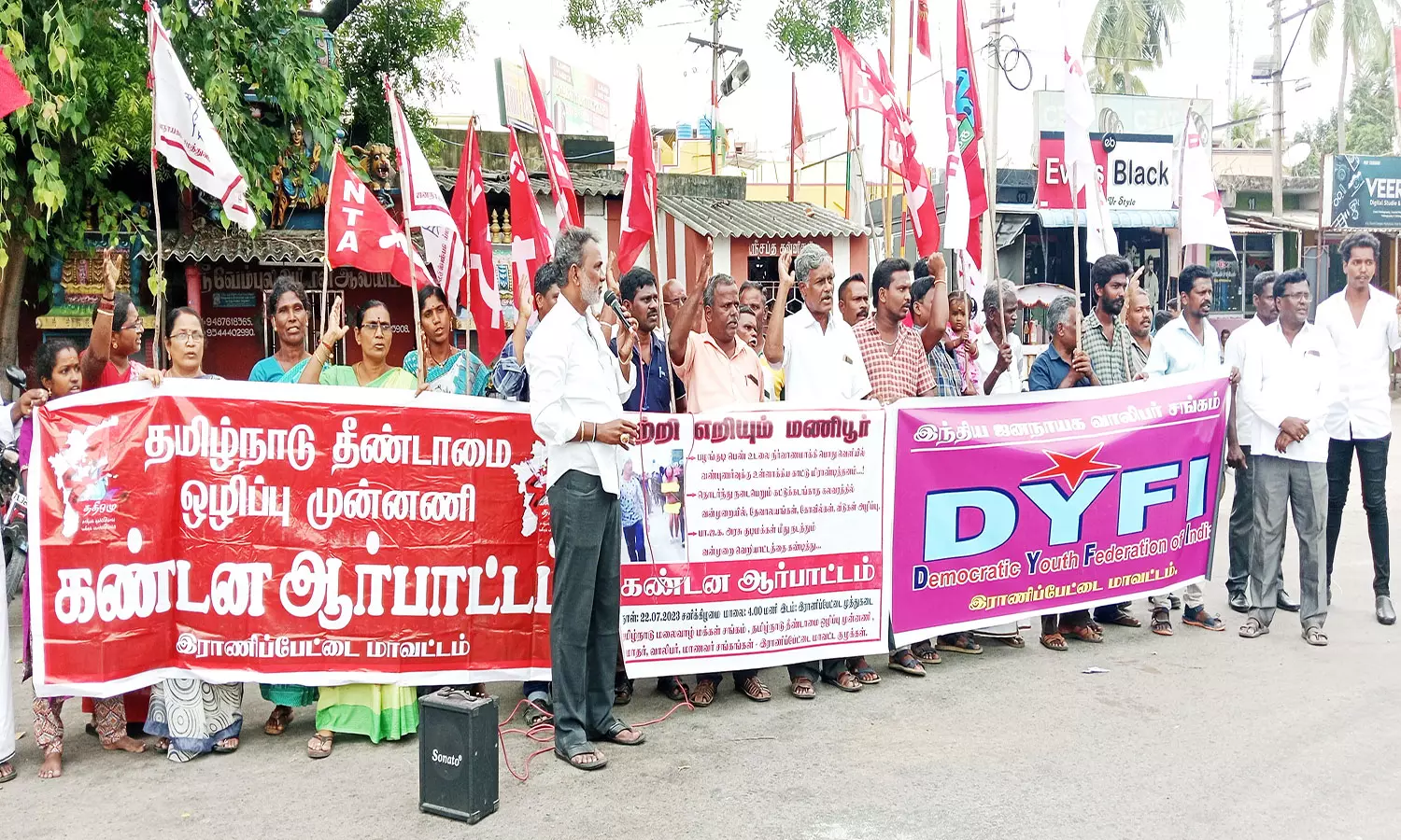 ராணிப்பேட்டை முத்துக்கடை பஸ் நிலையம் அருகே தீண்டாமை ஒழிப்பு முன்னணி, அனைத்திந்திய ஜனநாயக மாதர் சங்கம், இந்திய ஜனநாயக வாலிபர் சங்கம் ஆகிய கூட்டமைப்புகள் ஒருங்கிணைந்து மணிப்பூர் மாநிலத்தில் நடைபெற்ற கலவரத்தை கண்டிக்கும் விதமாக ஆர்ப்பாட்டத்தில் ஈடுபட்டனர்.