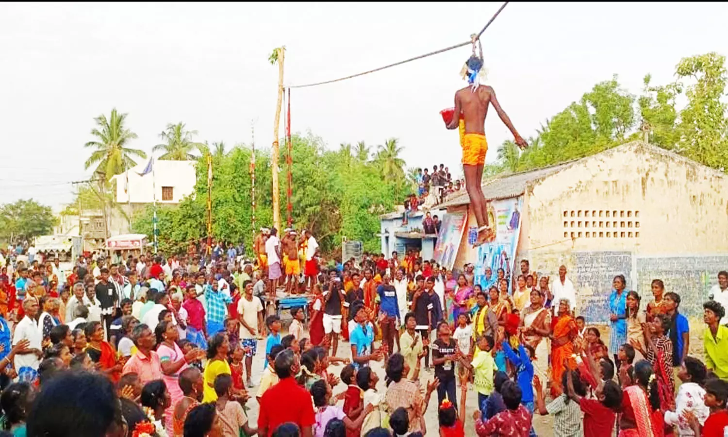 கோவில் திருவிழாவில் தலைமுடியின் மூலம் அந்தரத்தில் பறந்த பக்தர்கள்