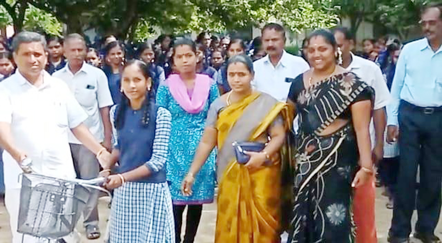 மாணவிகளுக்கு சைக்கிள் வழங்கப்பட்ட காட்சி.