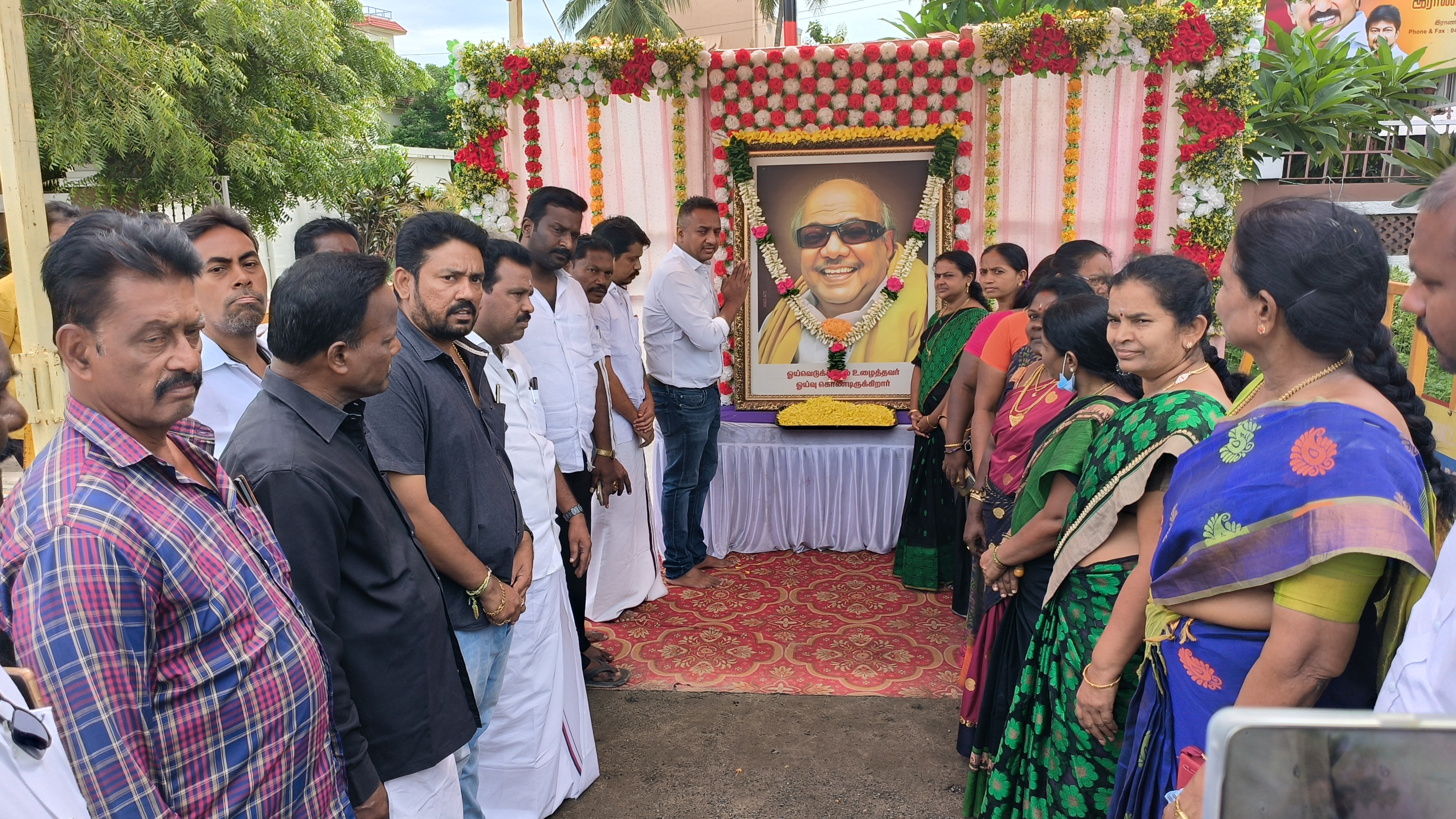 அதைத்தொடர்ந்து வாலாஜாபேட்டை அரசு மருத்துவமனை ஏதிரே வாலாஜாபேட்டை ஒன்றிய பெருந்தலைவர் சேஷாவெங்கட் தலைமையில் சிறப்பு அழைப்பாளராக கலந்து கொண்டு கருணாநிதி திருவுருவ படத்திற்கு மலர் தூவி மரியாதை செலுத்தினார்.