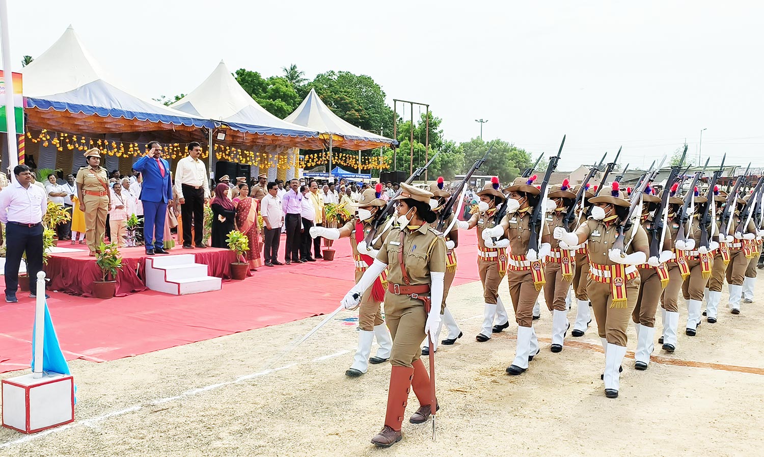 முன்னதாக போலீசாரின் அணிவகுப்பு மரியாதையை கலெக்டர் பாஸ்கர பாண்டியன், எஸ்.பி. தீபா சத்யன் ஆகியோர் போலீஸ் அணி வகுப்பு மரியதையை ஏற்றுக்கொண்டனர்.