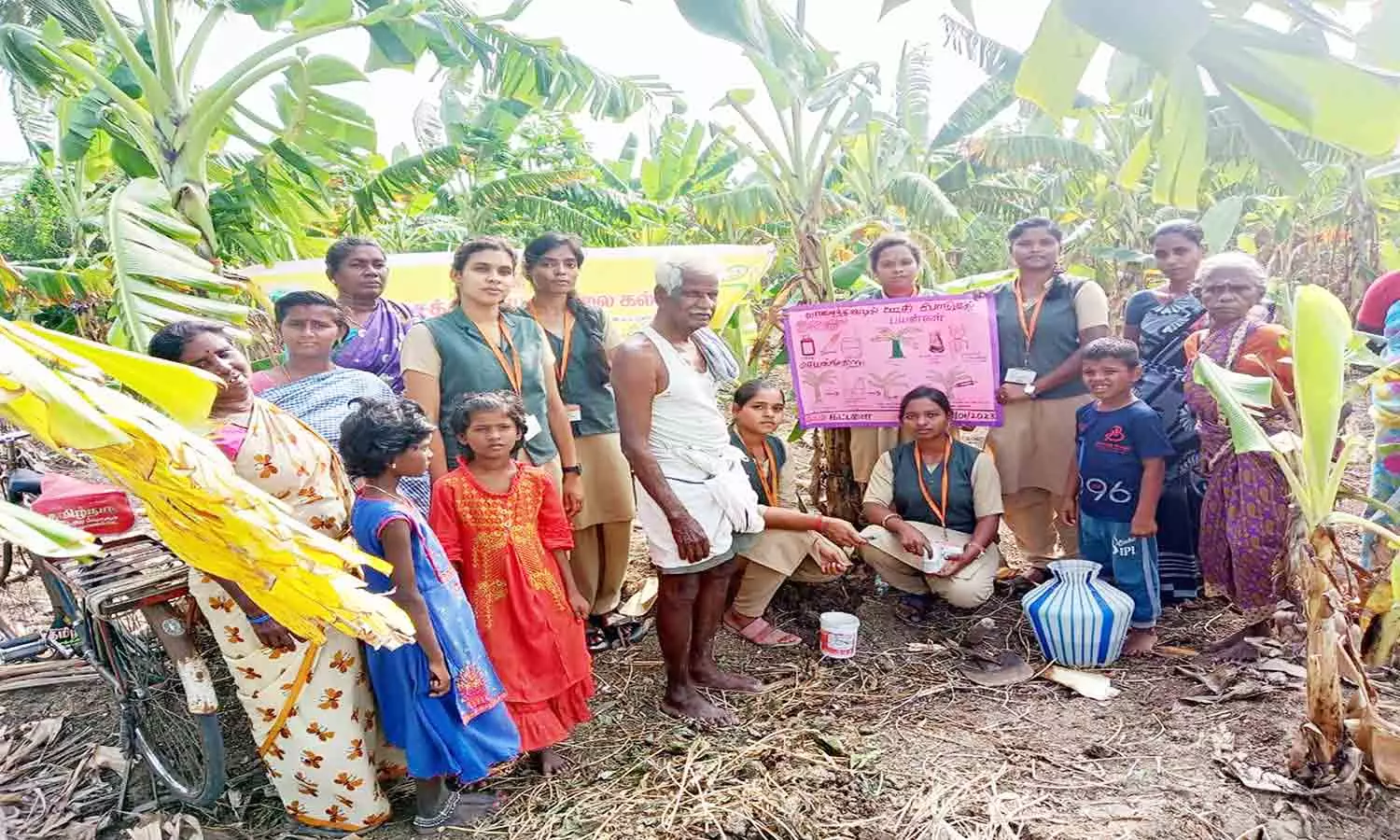 கல்லூரி மாணவிகள் விவசாயிகளுக்கு விழிப்புணர்வு செய்த காட்சி.