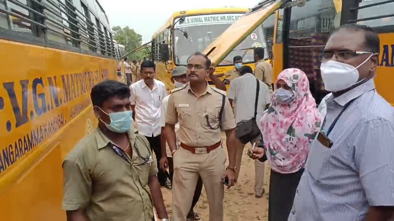 பள்ளி பஸ்களை அதிகாரிகள் ஆய்வு செய்த காட்சி.