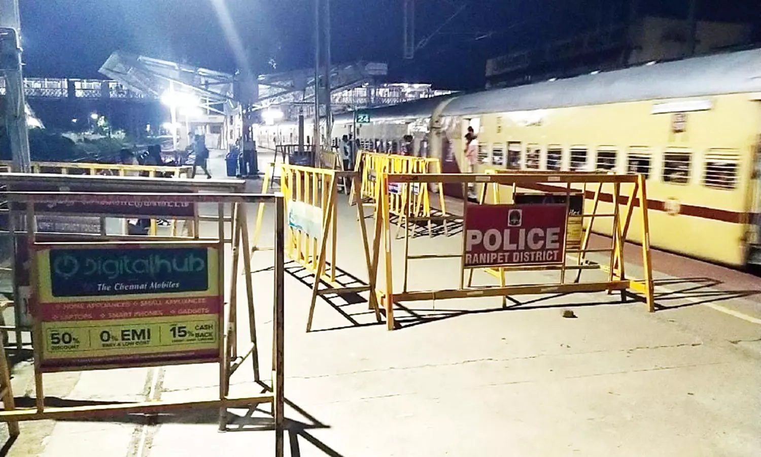 ரெயில் நிலையத்திற்குள் பாதுகாப்பிற்காக 30-க்கும் மேற்பட்ட இரும்பு தடுப்புகள் கொண்டு போலீசார் முதலாவது நடைமேடையில் தடுப்புகளை ஏற்படுத்தினர்.
