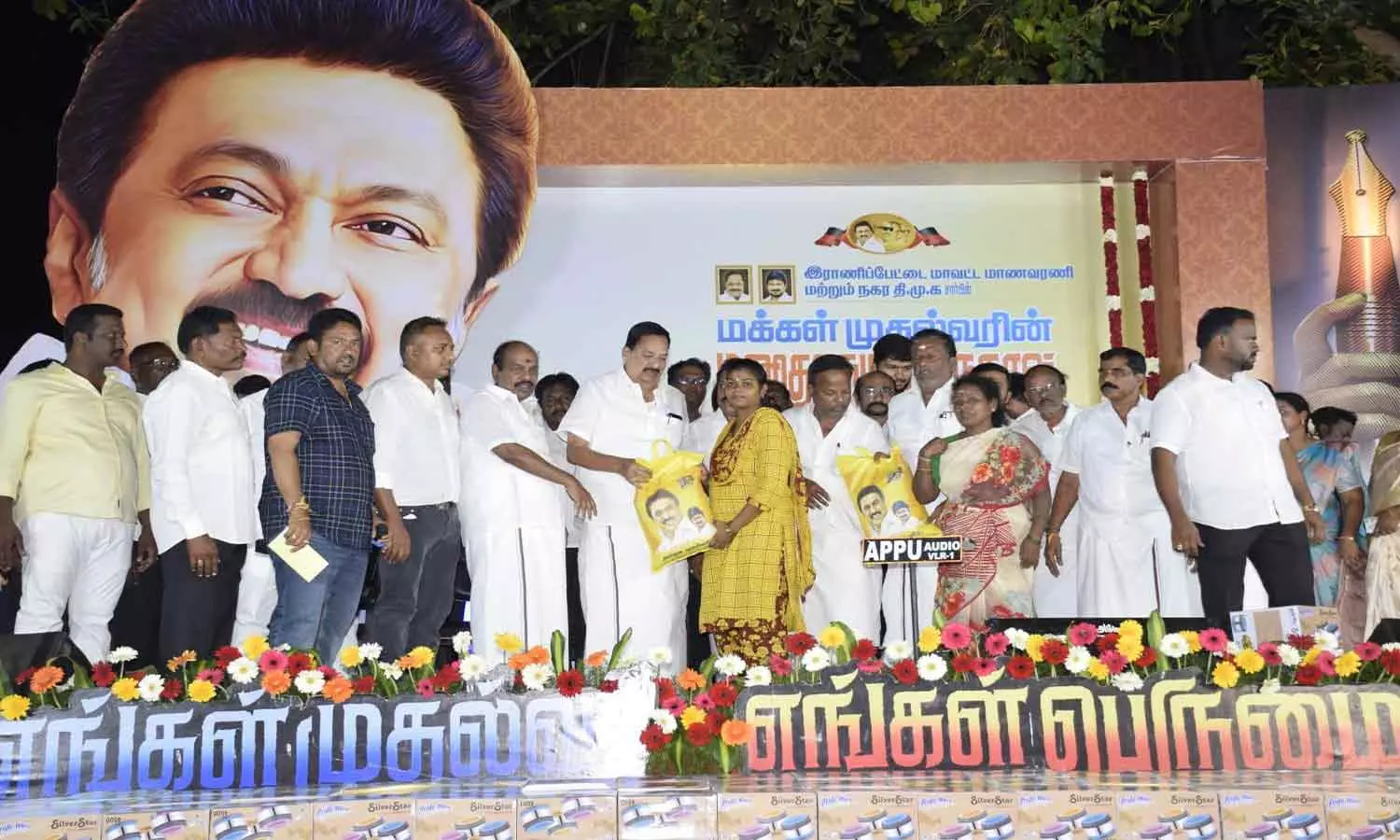 பொதுக்கூட்டத்திற்கு மாவட்ட மாணவர் அணி அமைப்பாளர் வினோத் தலைமை தாங்கினார். நகர செயலாளர் பூங்காவனம் வரவேற்றார்.இந்த பொதுக் கூட்டத்தில் தமிழக கைத்தறி மற்றும் துணிநூல் துறை அமைச்சர் ஆர்.காந்தி, எஸ். ஜெகத்ரட்சகன் எம்.பி., ஆகியோர் கலந்து கொண்டு நலதிட்ட உதவிகள் வழங்கி பேசினார்கள்.