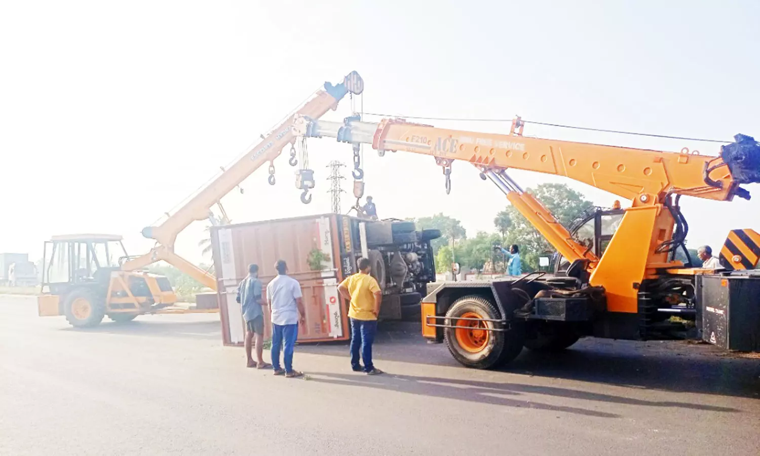 சாலையில் கவிழ்ந்த கன்டெய்னர் லாரியை கிரேன்கள் மூலம் அப்புறப்படுத்திய காட்சி.
