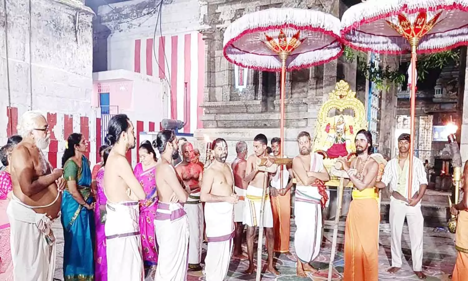 இதைத்தொடர்ந்து மாலையில் சிறப்பு அலங்காரம் செய்யப் பட்ட தங்க கேடயத்தில் எழுந்தருளி மங்கல வாத்தியங்களு டன் சுவாமி சன்னதி தெருகோடி வரை சென்று பக்தர்களுக்கு காட்சி தந்து அருள் பாலித்தார்.