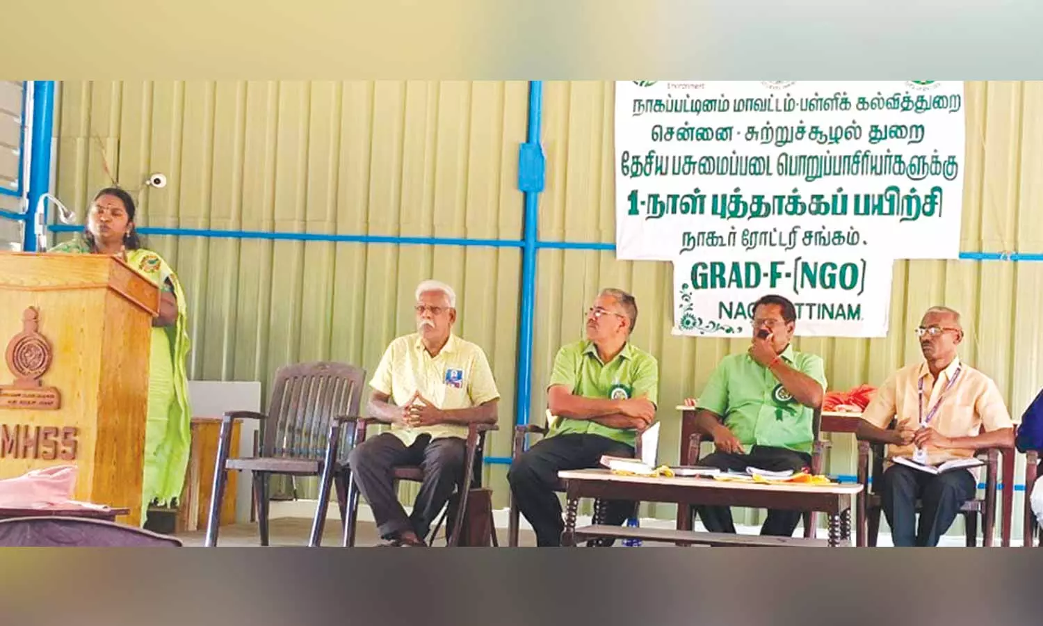 பள்ளிக்கல்வித்துறை சுற்றுச்சூழல் துறை கிரேடு எப் தொண்டு நிறுவனம் , நாகூர் ரோட்டரி சங்கம் இணைந்து நடத்திய பயிற்சி முகாமை முதன்மை கல்வி அலுவலர் சுபாஷினி தொடக்கி வைத்தார். நிகழ்ச்சியில் பள்ளி துணை ஆய்வாளர் ராமநாதன், நாகூர் ரோட்டரி கிளப் செயலர் ரமேஷ், பொருளாளர் கரிகாலன், தலைவர் இமையாத் அலி கிரெசென்ட் பள்ளியை சேர்ந்த ஆசிரியைகள் சியாமளா , பானு , மாலதி, பணி நிறைவு நகர் நல அலுவலர் அறிவழகன் ஆகி யோர் கலந்து கொண்டனர்.