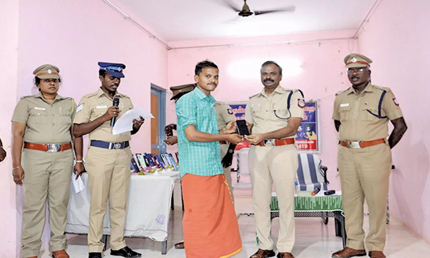 மீட்கப்பட்ட செல்போன்களை மாவட்ட போலீஸ் சூப்பிரண்டு சாம்சன் உரியவரிடம் ஒப்படைத்த காட்சி.