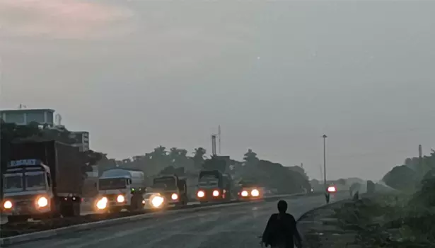 முகப்பு விளக்கு எரியவிட்டபடி சாலைகளில் ஊர்ந்து சென்ற வாகனங்கள்.