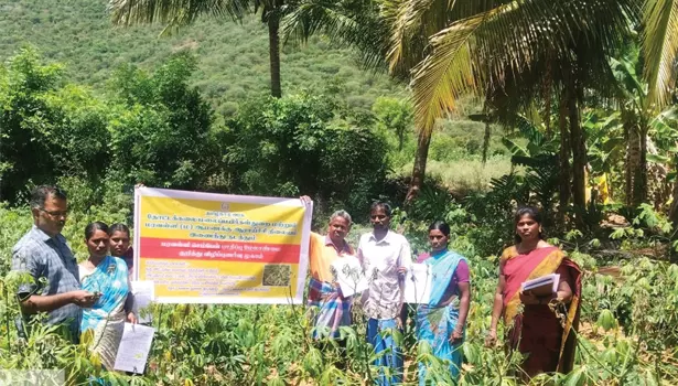 மரவள்ளித் தோட்டத்தில் செம்பேன் பூச்சி தாக்குதல் குறித்து ஆய்வு செய்த குழுவினர்.