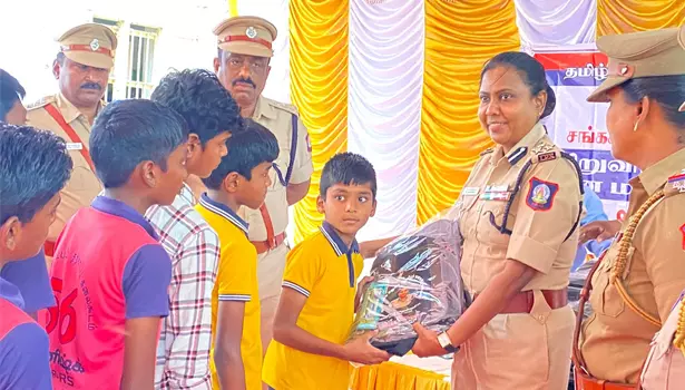 சங்ககிரி டி.எஸ்.பி அலுவலகத்தில் சேலம் சரக டி.ஐ.ஜி. ராஜேஸ்வரி மனமகிழ் மன்ற மாணவர்களுக்கு பள்ளி புத்தகப்பை வழங்கினார். அருகில் டி.எஸ்.பி. ராஜா உள்ளார்.