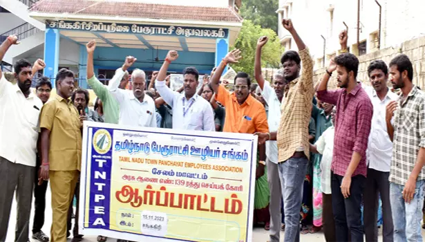 - சங்ககிரி பேரூராட்சி அலுவலகம் முன்பு தமிழ்நாடு பேரூராட்சி ஊழியர் சங்கம் சார்பில் ஆர்ப்பாட்டம் நடைபெற்றது.
