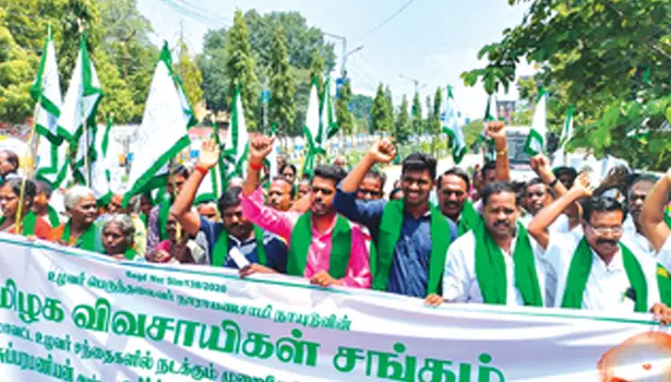 இந்த நிலையில் வேளாண் அதிகாரிகளின் இந்த நடவடிக்கைக்கு எதிர்ப்பு தெரிவித்தும், அவர்களை கண்டித்து தமிழக விவசாய சங்கம் சார்பில் இன்று நாட்டாமை கட்டிடம் முன்பு ஆர்ப்பாட்டம் நடந்தது.