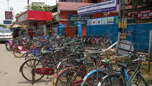 - மாணவி கள் பள்ளிக்கு வந்து செல்வதற்கு பயன்படுத்தும் சைக்கிள்களை நிறுத்து வதற்கு, பள்ளி வளாகத்தில் இடம் இல்லாததால், பள்ளிக்கு வெளியே சுற்றுச்சுவரை ஒட்டிய பகுதியில் இடம் ஒதுக்கப்பட்டுள்ளது.