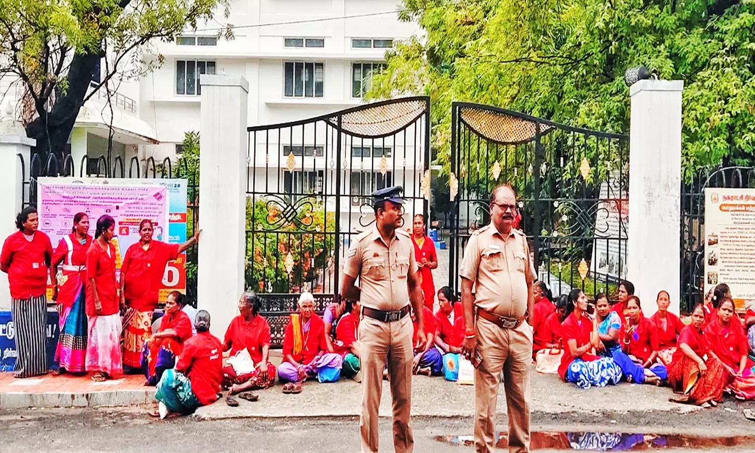 - இன்று காலை 200க்கும் மேற்பட்ட தூய்மை பணியாளர்கள் நகராட்சி அலுவலகம் முன்பு தரையில் அமர்ந்து தர்ணா போராட்டத்தில் ஈடுபட்டனர்.