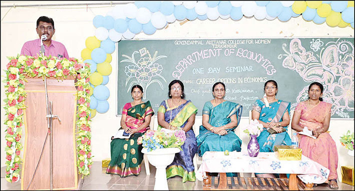 திருச்செந்தூர் கோவிந்தம்மாள் ஆதித்தனார் மகளிர் கல்லூரியில் பொருளியல் துறை சார்பாக பள்ளி மாணவிகளுக்கு கருத்தரங்கம் மற்றும் கண்காட்சி நடத்தப்பட்டது. கல்லூரி முதல்வர் ஜெயந்தி தலைமை தாங்கி குத்து விளக்கு ஏற்றி நிகழ்ச்சியை தொடங்கி வைத்தார். பொருளியல் துறை தலைவர் சண்முகவல்லி வரவேற்று பேசினார்.