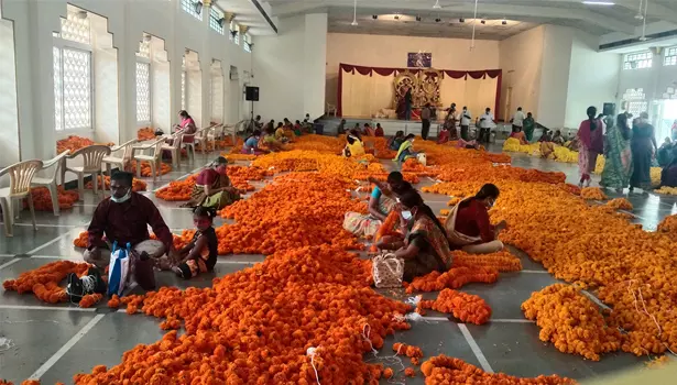 திருப்பதிக்கு அனுப்புவதற்காக பூக்களை தொடுக்கும் பணியில் பெண்கள்.
