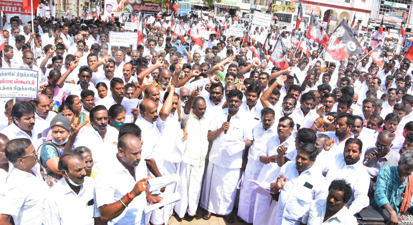 ஆர்ப்பாட்டத்தில் முன்னாள் அமைச்சர் பாஸ்கரன், மாவட்ட ஊராட்சி குழு தலைவர் பொன்பாஸ்கரன், அவை தலைவர் நாகராஜன் நகர் செயலாளர் ராஜா, முன்னாள் சட்டமன்ற உறுப்பினர்கள். குண சேகரன், நாகராஜன், ஒன்றிய செயலாளர்கள் ஸ்டிபன், கோபி, சேவியர், ஸிதர், பாரதி, மாவட்ட எம்.ஜி.ஆர். மன்ற துணை செயலாளர் இளங்கோவன், பாசறை மாவட்ட செயலாளர் பிரபு, மாவட்ட பொருளாளர் சரவணன், மேலும் மாவட்ட ஒன்றிய நகர நிர்வாகிகள் உட்பட 3 ஆயிரத்துக்கும் மேற்பட்ட நிர்வாகிகள் ஆர்ப்பாட்டத்தில் கலந்து கொண்டனர்.