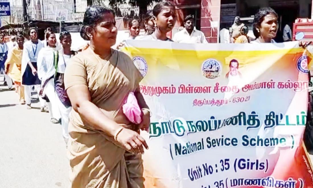 சிவகங்கை மாவட்டம் திருப்பத்தூர் ஆறுமுகம் பிள்ளை- சீதையம்மாள் கல்லூரியில் வாக்காளர்களுக்கு விழிப்புணர்வு ஏற்படுத்தும் வகையில் மாணவர்கள் பேரணி நடத்தினர். துணை முதல்வர் சூசைமாணிக்கம் முன்னிலையில் வட்டாட்சியர் வெங்கடேசன் தொடங்கி வைத்தார். துணை வட்டாட்சியர் ராஜா முகமது பங்கேற்றார். நாட்டு நல பணித்திட்ட மாணவர்கள் கல்லூரியில் இருந்து பேரணியாக மதுரை ரோடு, அண்ணா சிலை, காந்தி சிலை, பஸ் நிலையம் ஆகிய பகுதிகளில் விழிப்புணர்வு பதாகைகள் ஏந்தி ஊர்வலமாக சென்றனர். நாட்டு நலப்பணி திட்ட அலுவலர்கள்-பேராசிரியர்கள் கார்த்திகேயன், நாகராஜன், மாரிக்கண்ணு ஆகியோர் ஒருங்கிணைப்பு செய்தனர். இதில்
