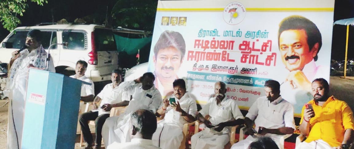 சிவகங்கை மாவட்டம் திருப்பத்தூர் வடக்கு ஒன்றியம் மற்றும் நெற்குப்பை பேரூர் இளை ஞர் அணி சார்பாக திராவிட மாடல் அரசின் ஈடில்லா ஆட்சி ஈராண்டே சாட்சி சாதனை விளக்க தெருமுனை பிரச்சாரக் கூட்டம் வேலங்குடி கிராமத்தில் உள்ள பேருந்து நிறுத்தம் அருகே நடை பெற்றது.