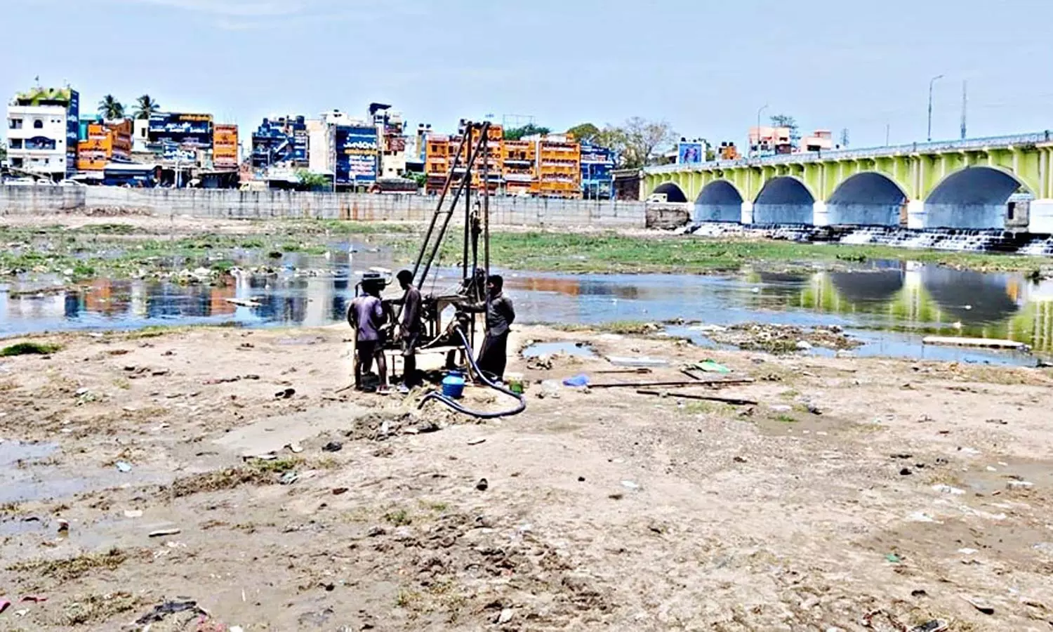 மதுரை வைகையாற்றுக்குள் மெட்ரோ ரெயில் திட்டத்துக்காக நவீன எந்திரம் மூலம் மண் பரிசோதனை நடந்தது.