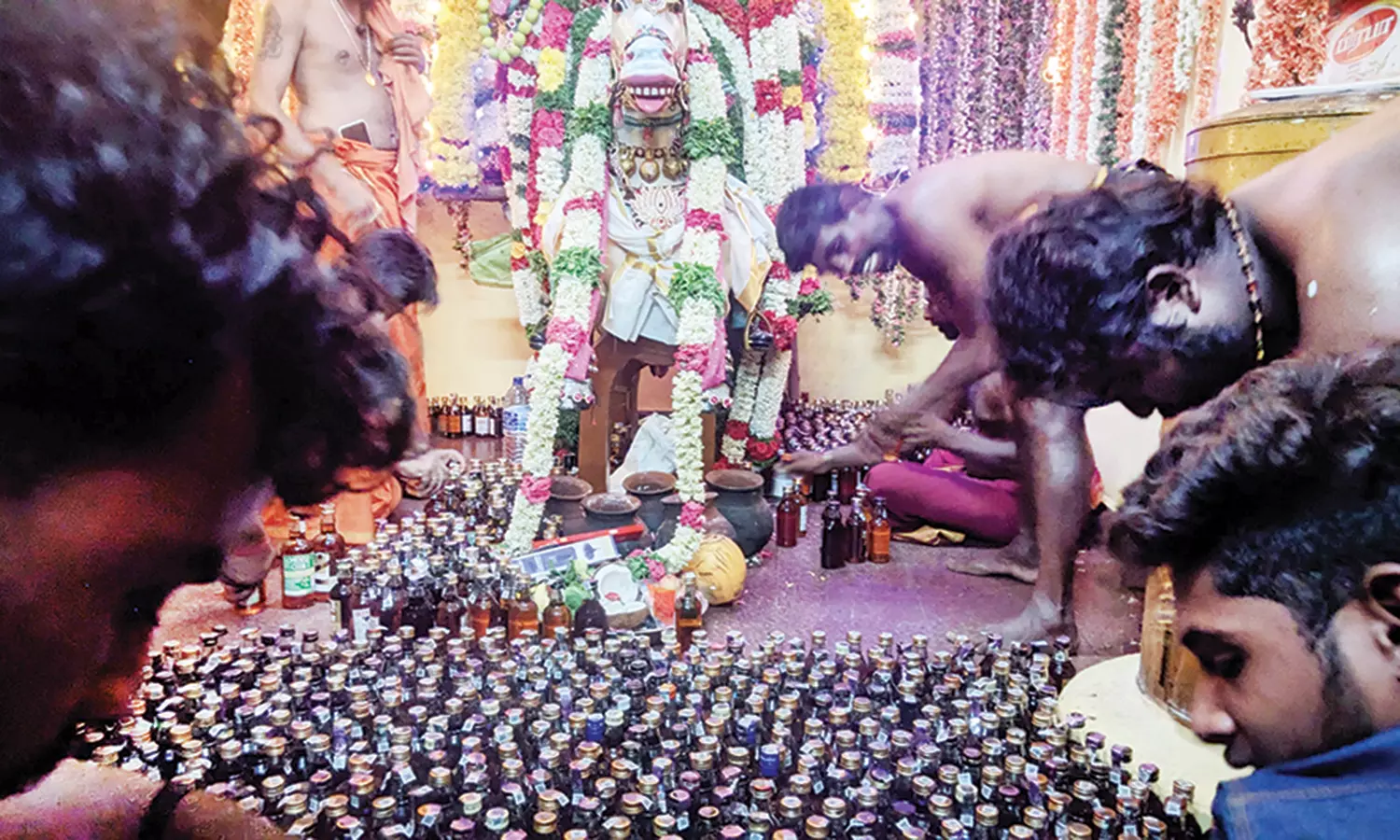 சோனை கருப்பசாமிக்கு படையல் வைக்கப்பட்ட மதுபாட்டில்களை படத்தில் காணலாம்.