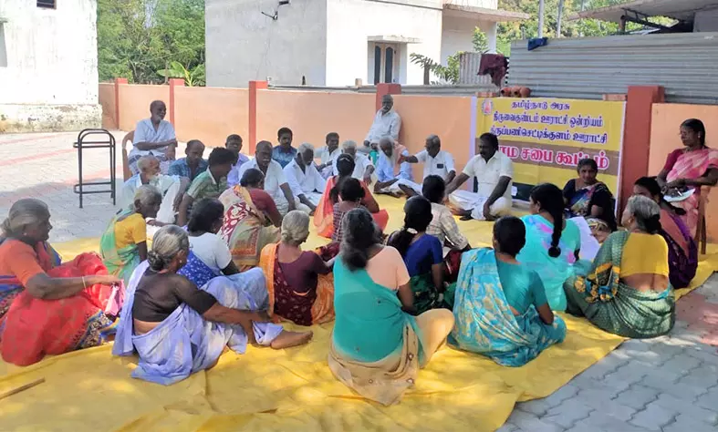 தலைவர் சுயம்புலிங்கம் தலைமையில் கிராமசபை கூட்டம் நடந்த காட்சி.