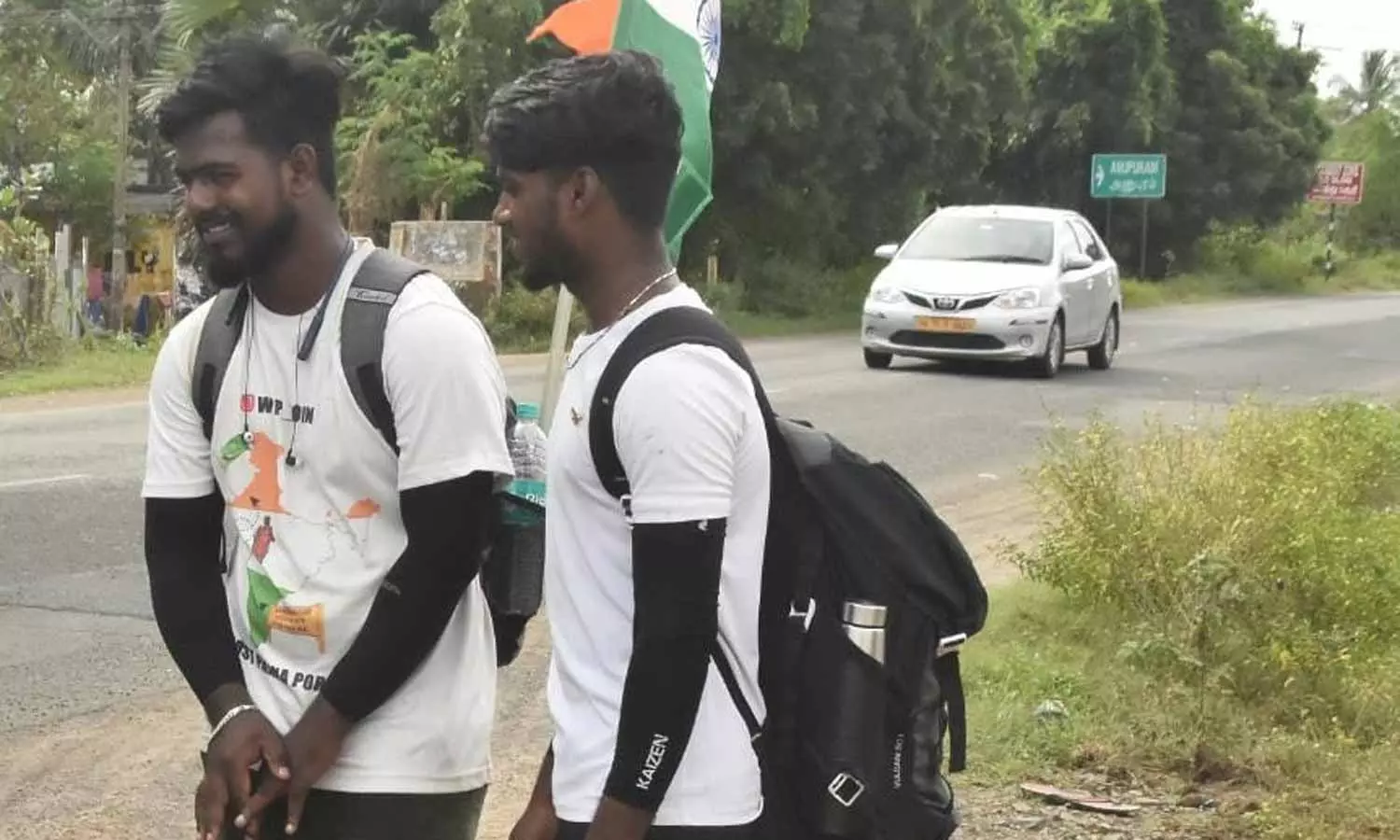 புதுச்சேரி மாநிலம் காரைக்கால் பகுதியை சேர்ந்தவர் ஜானி (வயது 20), போட்டோகிராபர். இவரது நண்பர் பைந்தமிழ் (வயது19). இவர் அங்குள்ள தனியார் கல்லூரியில் வேளாண்மை இன்ஜினியரிங் படித்து வருகிறார். இருவரும் உணவை வீணாக்குவதை தடுக்கும் விழிப்புணர்விற்காக காரைக்காலில் இருந்து இந்தியா-பாகிஸ்தான் எல்லையான வாகா வரையான 3 ஆயிரம் கி.மீ., நடைபயணம் மேற்கொண்டு வருகின்றனர்.