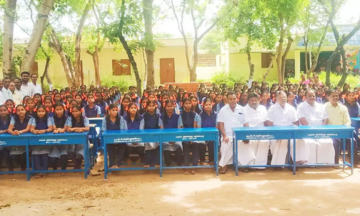 அரசு பெண்கள் பள்ளியில் முன்னாள் அமைச்சர் எம்.எல்.ஏ. அன்பழகன் மேசைகளை வழங்கிய காட்சி .