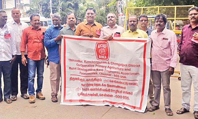அதன்படி இன்று சென்னை வள்ளுவர் கோட்டத்தில் நடைபெற்ற மாநில அளவிலான தர்ணா போராட்டத்தில் அகில இந்திய வங்கி ஊழியர் சங்க பொது செயலாளர் சி.எச்.வெங்கடாசலம், தமிழ்நாடு வங்கி ஊழியர் சம்மேளன பொது செயலாளர் இ.அருணாசலம், மாநில கூட்டுறவு தொடக்க வேளாண்மை மற்றும் ஊரக வளர்ச்சி வங்கி ஊழியர் சங்க மாநில பொது செயலாளர் எஸ்.ஜினச்சந்திரன், திருவள்ளூர், காஞ்சிபுரம், செங்கற்பட்டு மாவட்ட கூட்டுறவு தொடக்க வேளாண்மை மற்றும் ஊரக வளர்ச்சி வங்கி ஊழியர் சங்க மாவட்ட செயலாளர் கே.கிருஷ்ணமூர்த்தி, மாவட்ட தலைவர் எம்.யுவராஜ், மாவட்ட பொருளாளர் ஜி.மதியழகன் மற்றும் 25 கூட்டுறவு வங்கி பணியாளர்கள், தமிழக அளவிலான 180 தொடக்க வேளாண்மை மற்றும் ஊரக வளர்ச்சி வங்கியின் பணியாளர்கள் பெருந்திரளாக கலந்துக் கொண்டனர்.