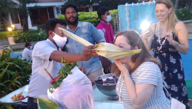 பனைஓலை பட்டையில் பதநீர் குடித்த வெளிநாட்டு சுற்றுலா பயணி
