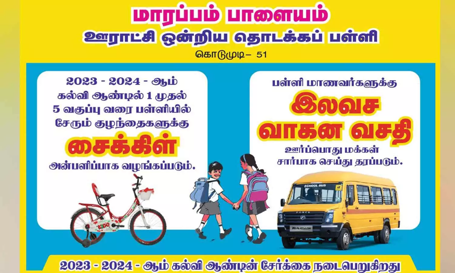மாரப்பம்பாளையம் அரசு பள்ளியில் சேரும் மாணவ, மாணவிகளுக்கு இலவச சைக்கிள், வாகன வசதி என பொதுமக்கள் சார்பில் அச்சிடப்பட்டுள்ள போஸ்டரை படத்தில் காணலாம்.