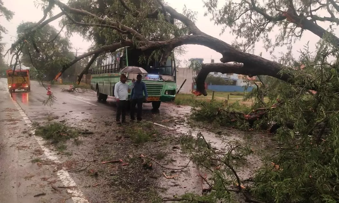 - பலத்த காற்றுடன் கூடிய மழையின் காரணமாக அந்த சாலையில் வாகனங்கள் எதுவும் வரவில்லை. யாரும் பார்க்காததால் மரம் வெட்டி அகற்றப்படவில்லை.