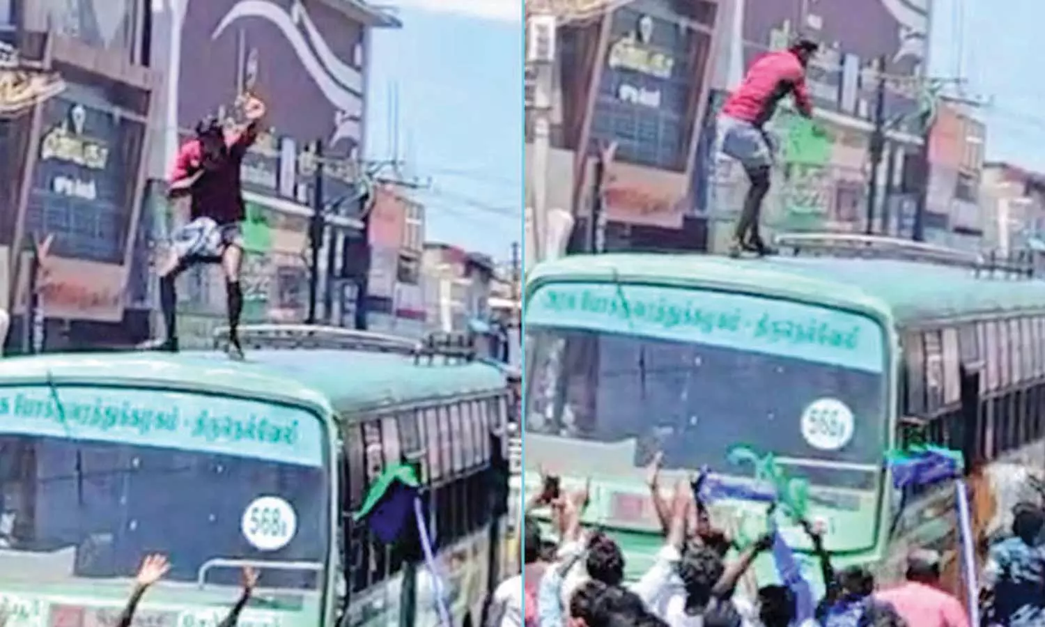 - ஒரு வாலிபர் பஸ்சின் மேற்கூரை மீது ஏறி ஆட்டம் போட்டார். இதனால் பயணிகள் அதிர்ச்சி அடைந்தனர்.