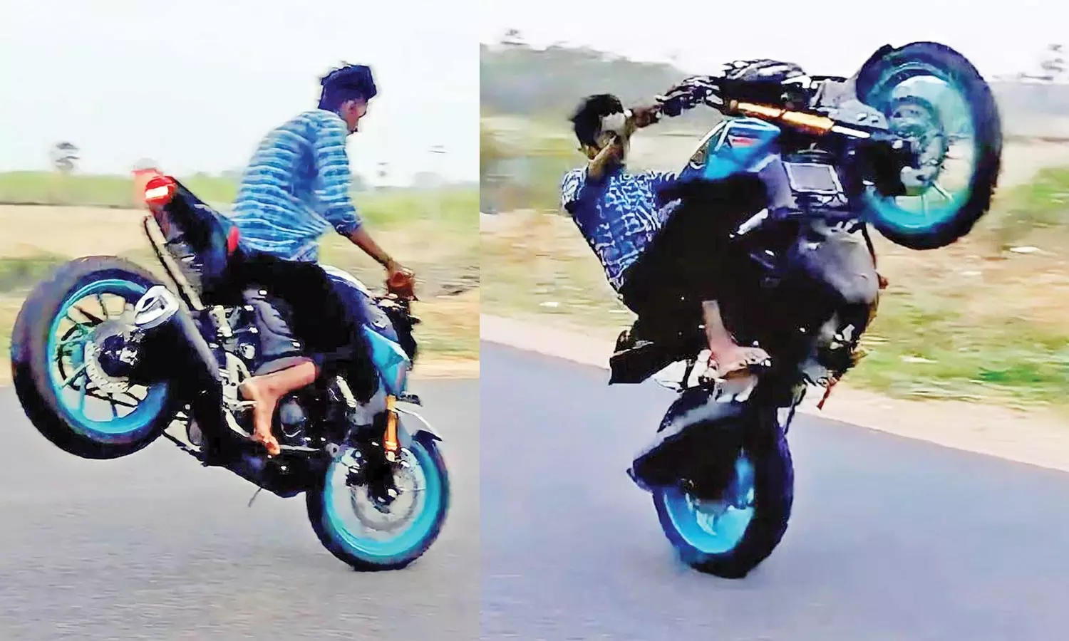 அப்போது சாலையில் சாகசத்தில் ஈடுபட்ட அப்புவிளை இசக்கியம்மன் கோவில் தெருவை சேர்ந்த செந்தில்குமரன் மகன் சிவா (வயது 20), ஆயன்குளம் பீர்முகமது மகள் சேக் முகமது (20), சுப்பிரமணியபுரம் செல்வகுமார் மகன் ராகுல்(18), திசையன்விளை காமராஜர் நகர் கருப்பசாமி கோவில் தெருவை சேர்ந்த சந்துரு(18) ஆகியோரை பிடித்து அவர்களிடம் இருந்து மோட்டார் சைக்கிளை போலீசார் பறிமுதல் செய்தனர்.