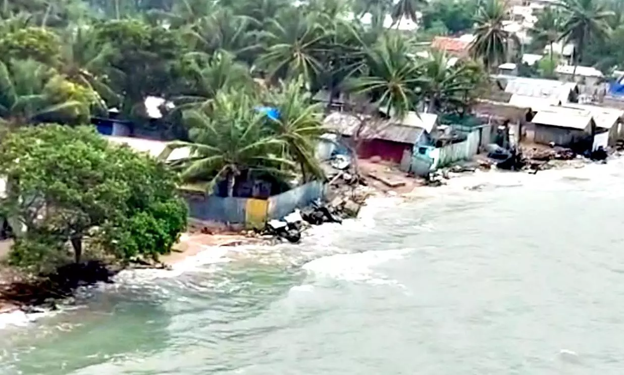 காற்றழுத்த தாழ்வுநிலை எதிரொலி- பாம்பனில் கடல் சீற்றம்: வீடுகளில் தண்ணீர் புகுந்தது